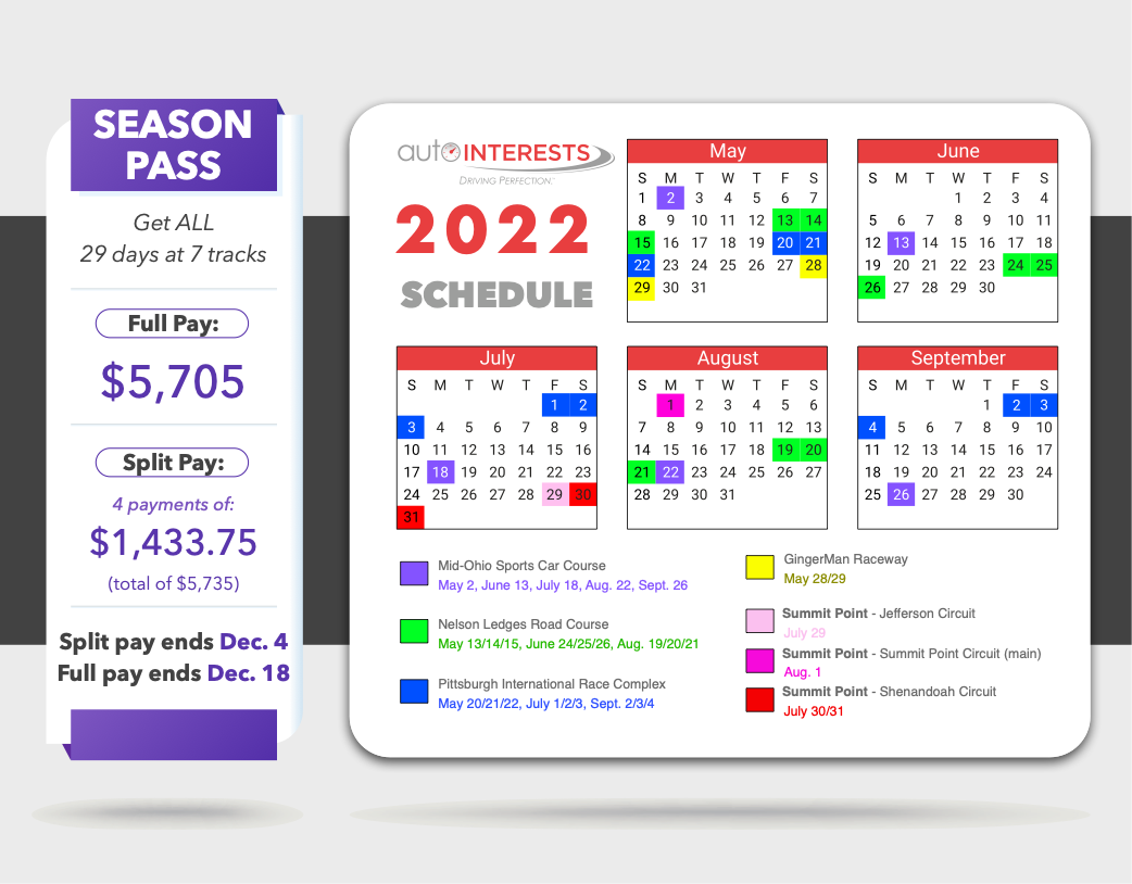 Fast Passes and promotional value gift certificates may be used towards the Season Pass. Balances not paid by their due date result in forfeiture of the payments paid and the associated reserved spot at the events. Season Passes are NOT eligible for ANY credits or transfers. However, if an HPDE Protection Plan was purchased, Season Pass holders are eligible for the coverages provided by the HPDE Protection Plan as outlined in its terms and conditions. Season Pass purchases are only valid for the driver named at initial purchase. The event dates may not be split up among multiple drivers, or otherwise transferred or "shared".