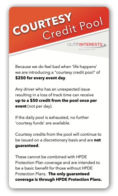 Because we do feel bad when 'life happens' we are introducing a "courtesy credit pool" of $250 for every event day. Any driver who has an unexpected issue resulting in a loss of track time can receive up to a $50 credit from the pool once per event (not per day). If the daily pool is exhausted, no further 'courtesy funds' are available. Courtesy credits from the pool will continue to be issued on a discretionary basis and are not guaranteed. These cannot be combined with HPDE Protection Plan coverage and are intended to be a basic benefit for those without HPDE Protection Plans. The only guaranteed coverage is through HPDE Protection Plans.