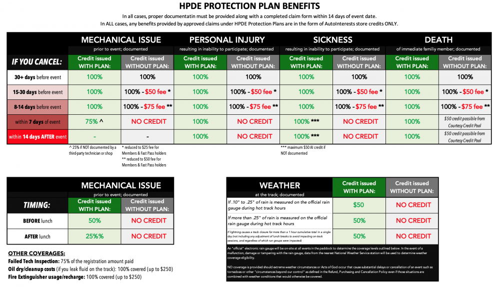 The purchase of HPDE Protection Plans are strictly non-refundable, non-transferable, may not be applied to alternate dates/events and only provide benefits to the original purchaser. If a driver cancels or fails to attend an event for which an HPDE Protection Plan was purchased and chooses to use proceeds from approved benefits to sign up for an alternate event, no coverage applies to the alternate event unless an additional HPDE Protection Plan is purchased.