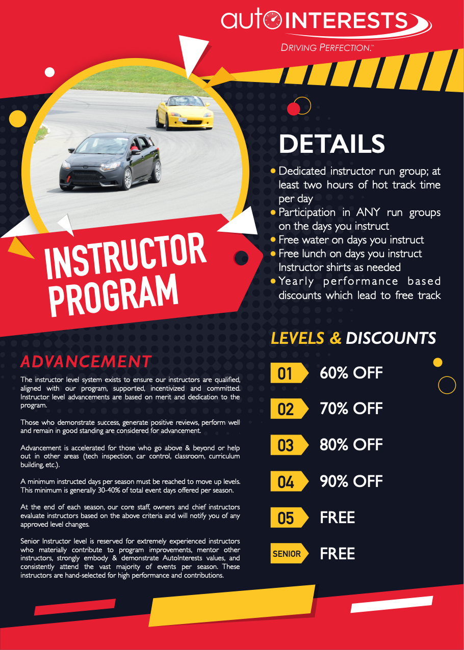 A driver that meets the minimum criteria, but has no prior instruction experience can become qualified at an AutoInterests event. The candidate would attend an HPDE registered as a driver, and receive an evaluation from one of our chief instructors during the track day. This evaluation process MUST be approved and pre-arranged in advance – do not expect to simply register, show up, and be evaluated. Please contact us at events@autointerests.com if you fall into this category and are interested in becoming an instructor.