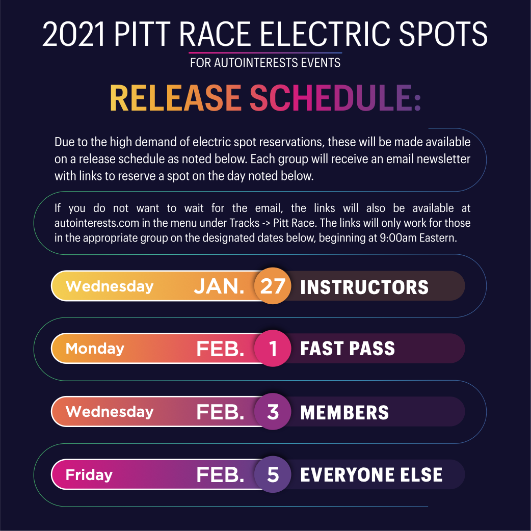 If you wish to reserve an electric spot at ANY of our Pitt Race events this season, MARK YOUR CALENDAR for the release date of these spots!