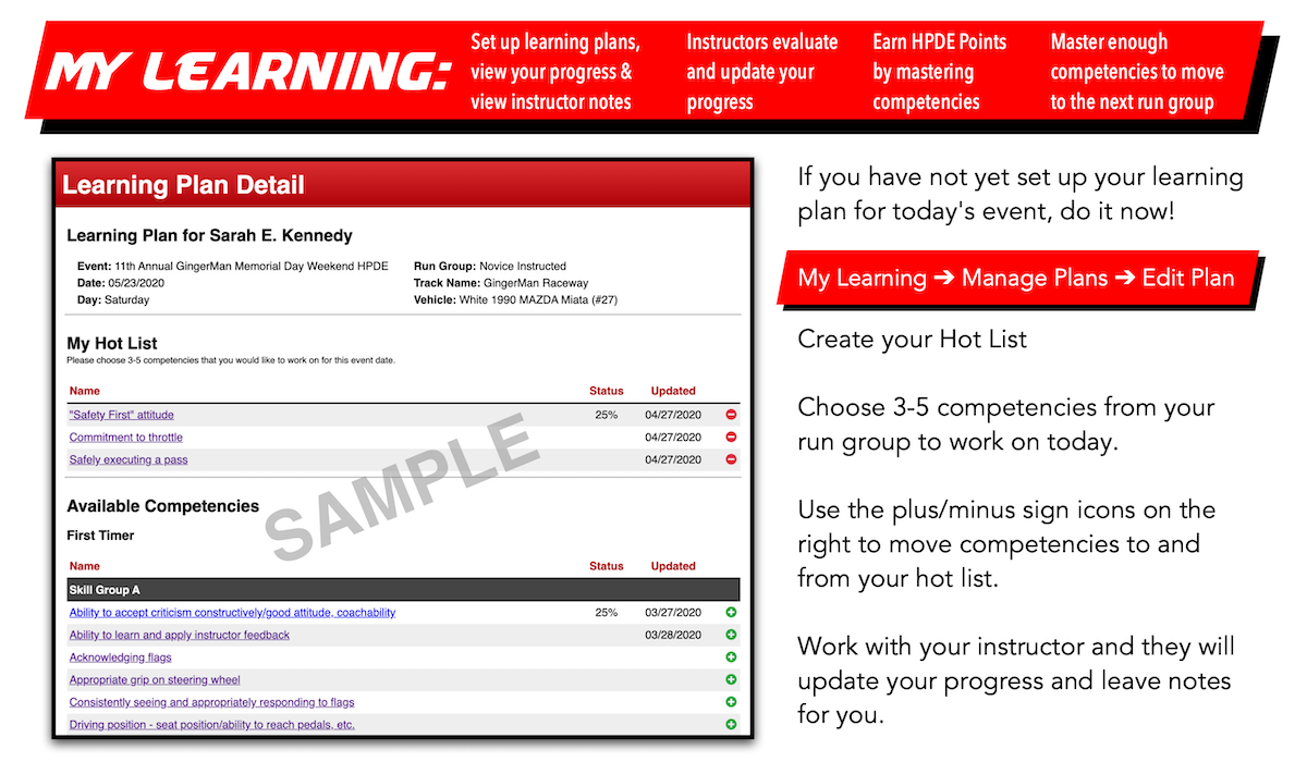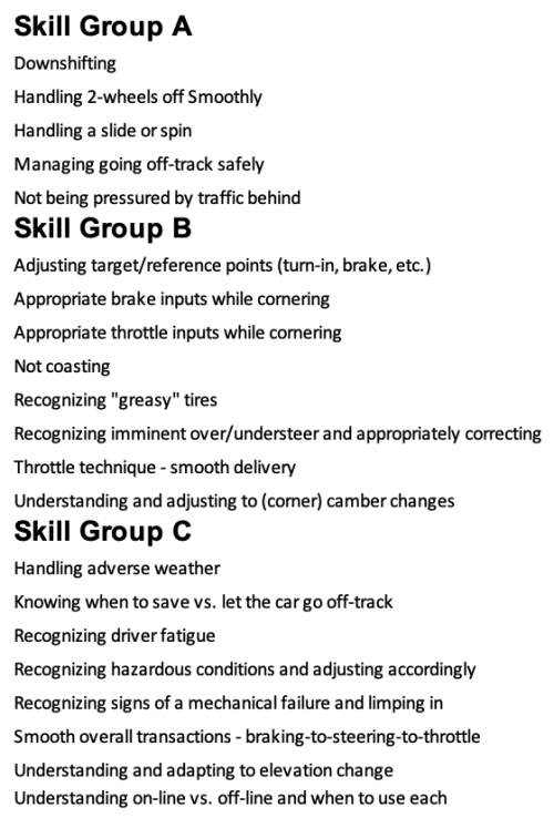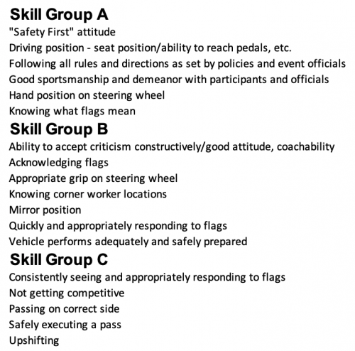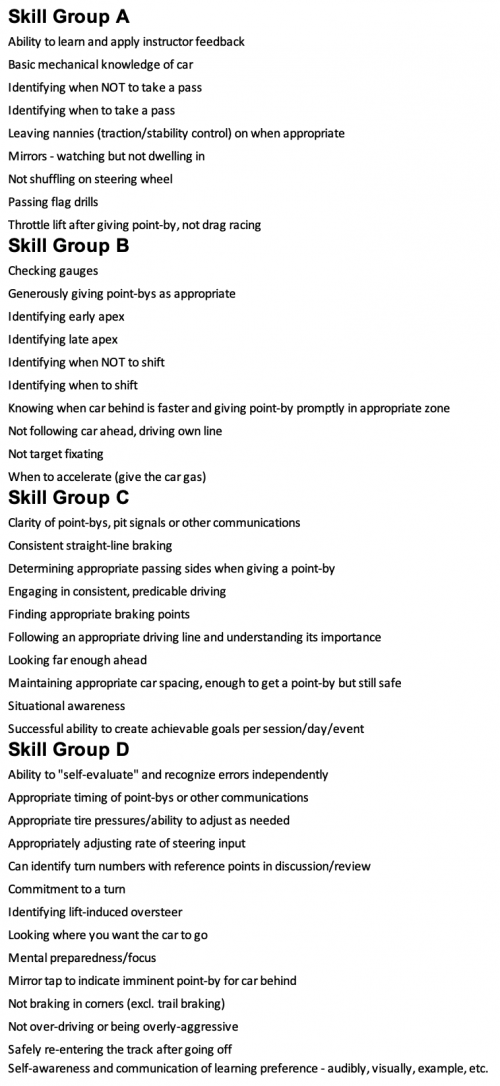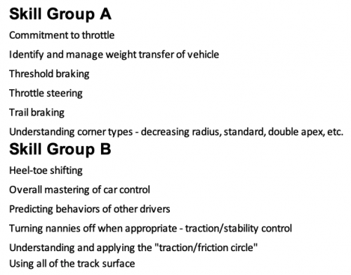 Drivers utilize this system to view all competencies and skill groups associated with their current run group. At each event, you should be building a "Hot List" of 3-5 items to work on.