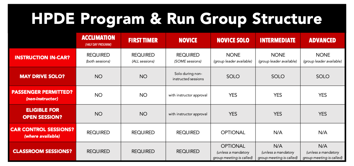 Proper placement of drivers in run groups is absolutely critical to provide a great experience for all drivers and a successful event. We don’t base run group placement on arbitrary numbers of “track days” (with or without instruction) or subjective sign-offs from instructors. Instead, we use driver skillset and competencies.