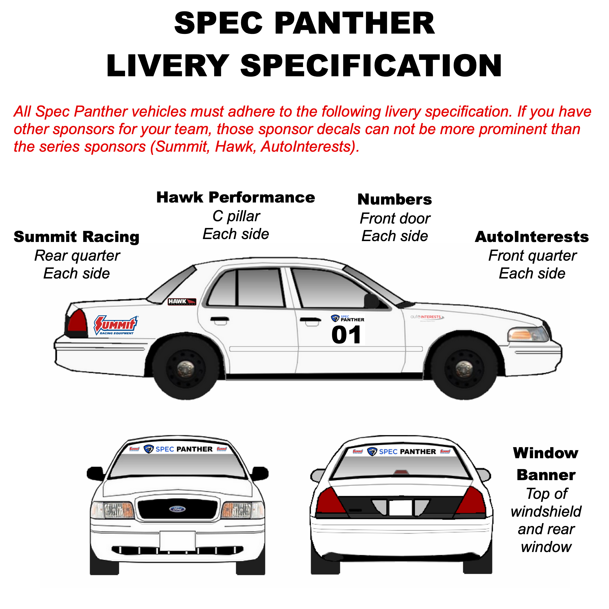 Spec Panther is a racing series formed by AutoInterests, LLC. Its name is derived from the Ford “Panther” platform that the Ford Crown Victoria, Mercury Grand Marquis and Lincoln Town Car were built on. This series has no affiliation with Ford Motor Company or any of its subsidiaries – it retains ownership of the respective trademarks for the naming of its vehicles/models.
