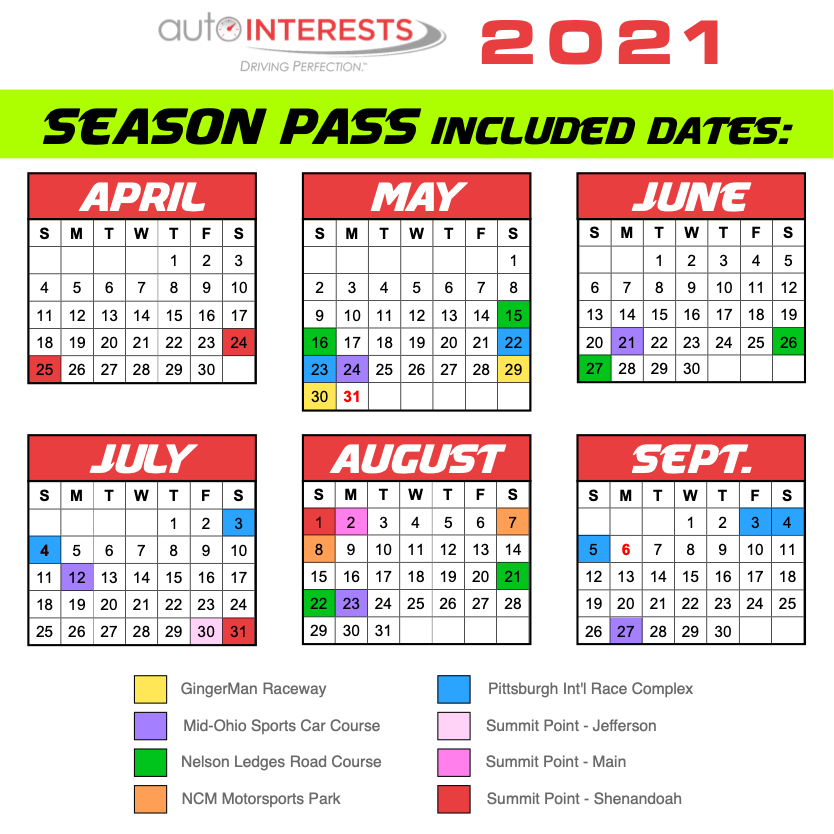 Our 2021 Season Pass includes 28 full HPDE days at 8 different tracks! (There are 31 days in our 2021 schedule, however there are some dates not available in the Season Pass due to different program formats and group events.