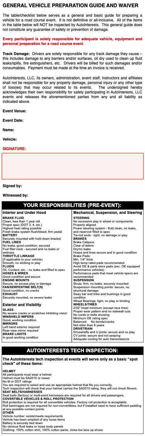 If you have any questions about your vehicle or safety equipment meeting requirements, email events@autointerests.com PRIOR to registering for an event!